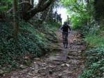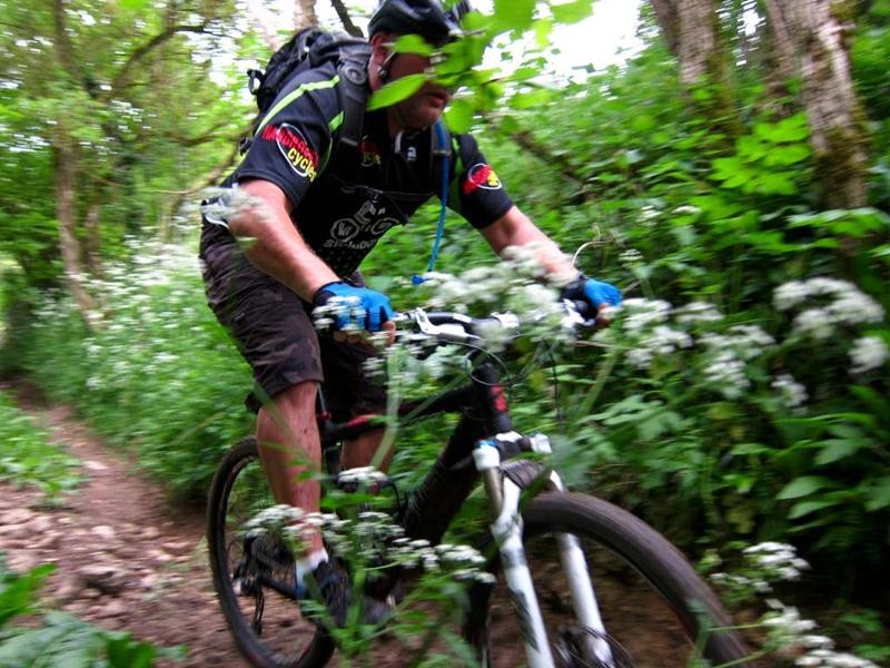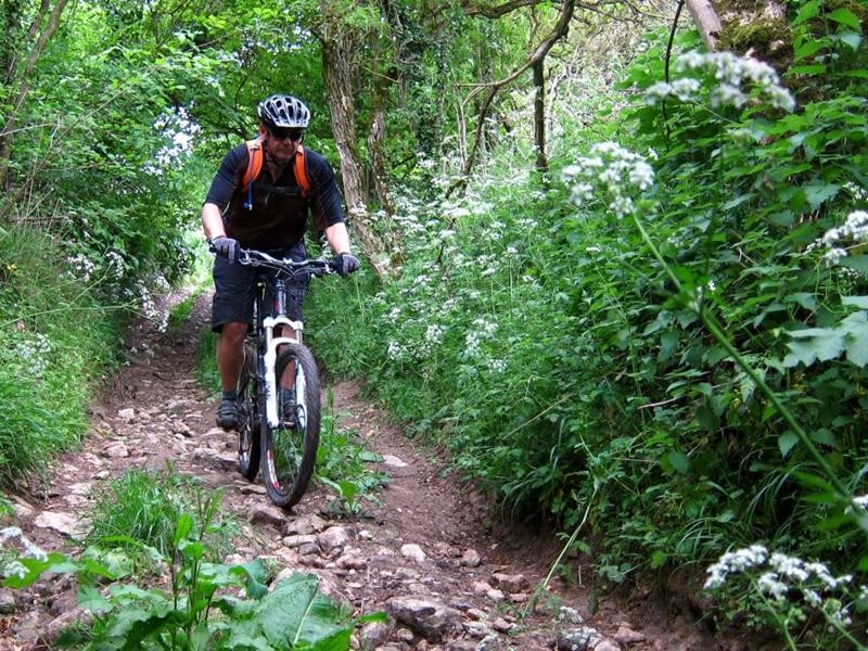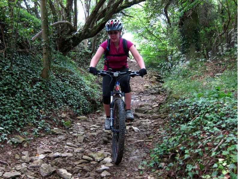 The chat with the horsey ladies had given me a chance to think and get the route right in my mind again and off we went. A ride down a very overgrown bridleway confirmed what the horsey ladies had been on about and saw Sharon shouting in what I can only assume to be an ancient Gaelic dialect – I’ve never heard language like it and I used to work on the Liverpool docks! Some field side tracks brought us to the top of a stream bed descent. Unfortunately, due to the recent extreme dry weather the stream was dry but it was still a fun, loose rock descent.