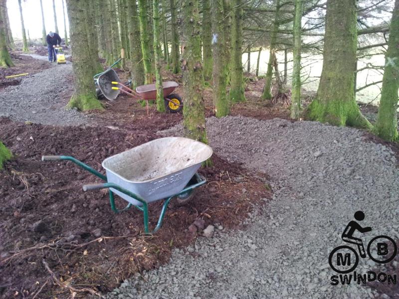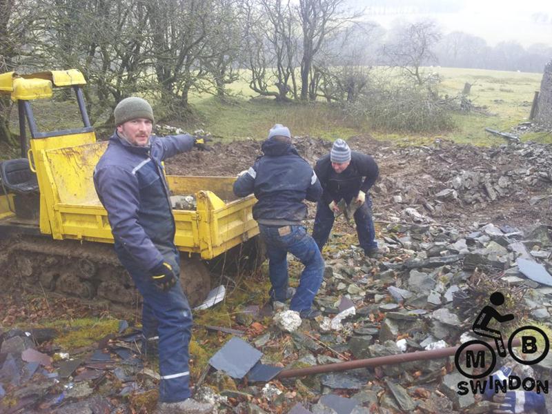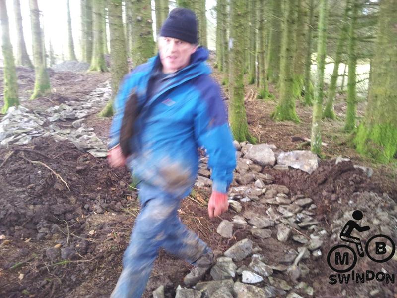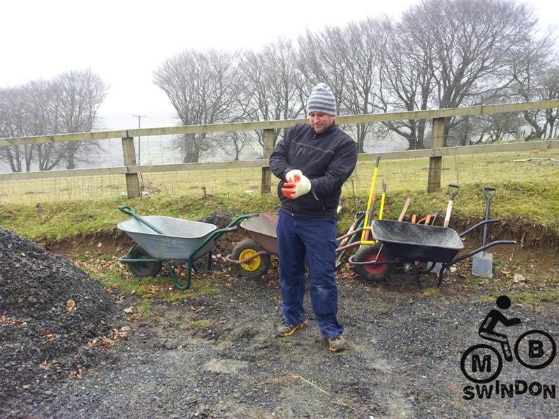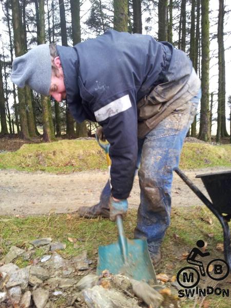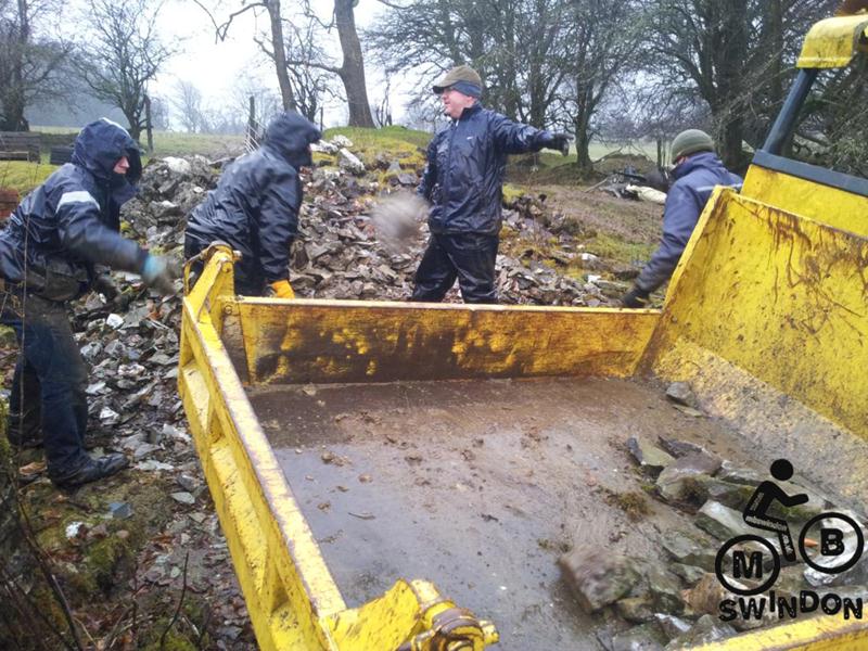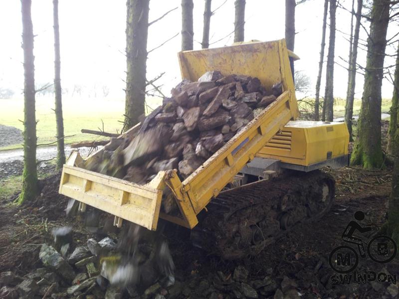 Sam Brown joined us early the next morning.  An icy wind was blowing as we pushed the barrows of tools to the top of the trail. On the plus side the overnight rain had ceased. We immediately got to work dumping rocks into the trail base and hand shifting scalpings from piles that Jay had dumped ready for us. The dumper was used to shift more rocks from near the Mudtrek HQ and also to shift scalpings. Mud and rocks were used to build up berms on the tight corners.