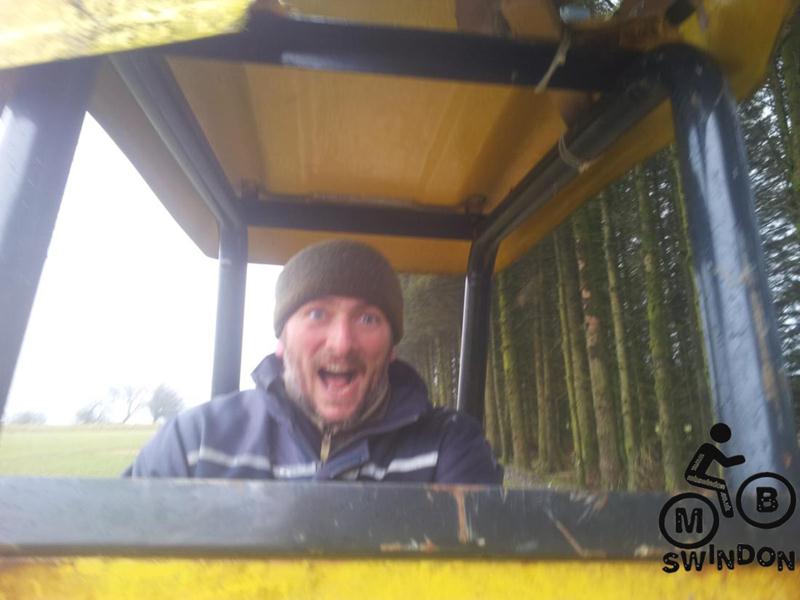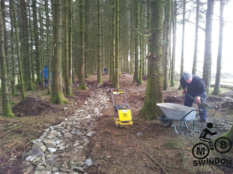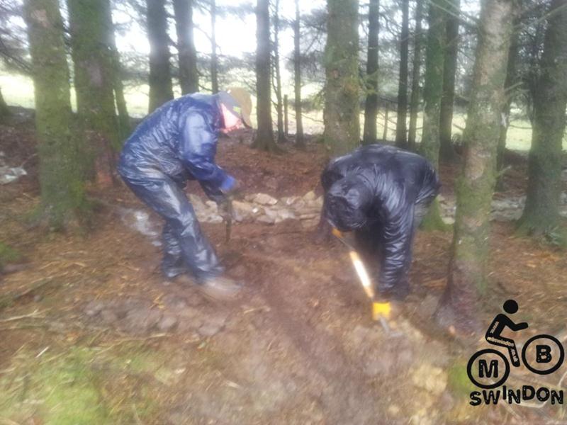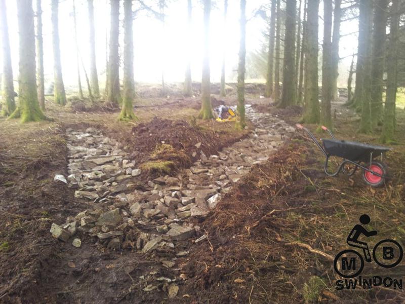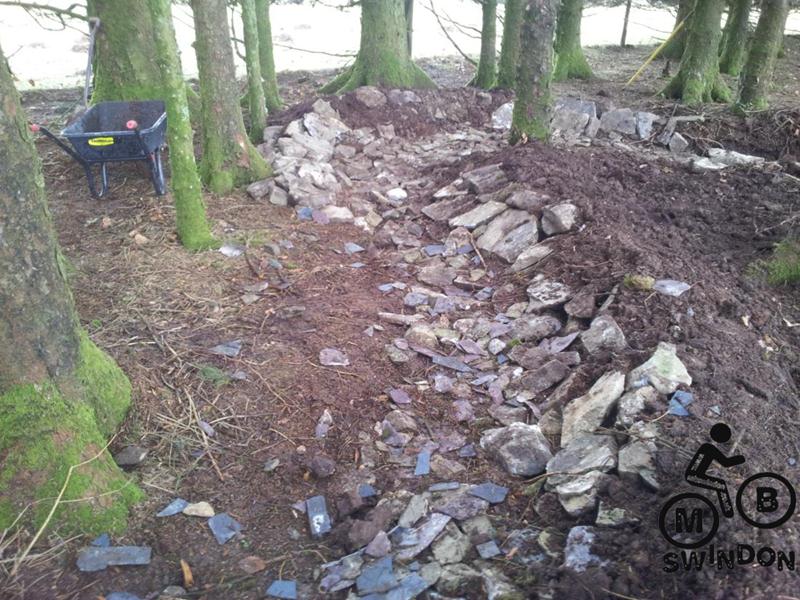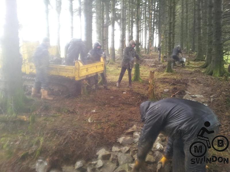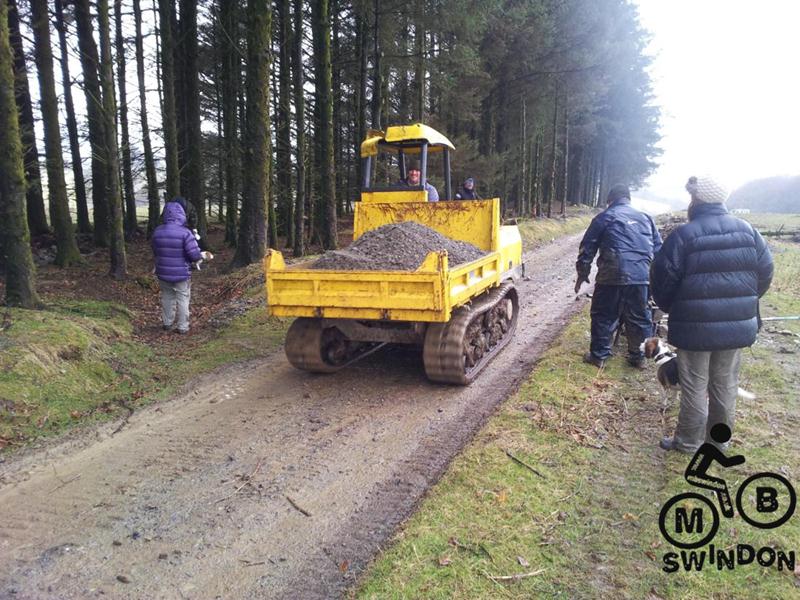 Sam Brown joined us early the next morning.  An icy wind was blowing as we pushed the barrows of tools to the top of the trail. On the plus side the overnight rain had ceased. We immediately got to work dumping rocks into the trail base and hand shifting scalpings from piles that Jay had dumped ready for us. The dumper was used to shift more rocks from near the Mudtrek HQ and also to shift scalpings. Mud and rocks were used to build up berms on the tight corners.
