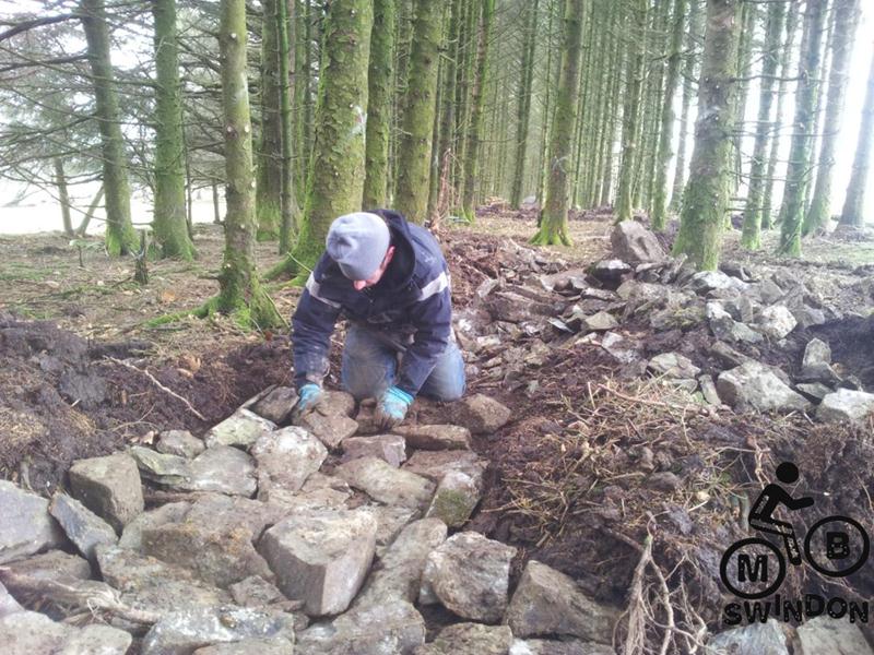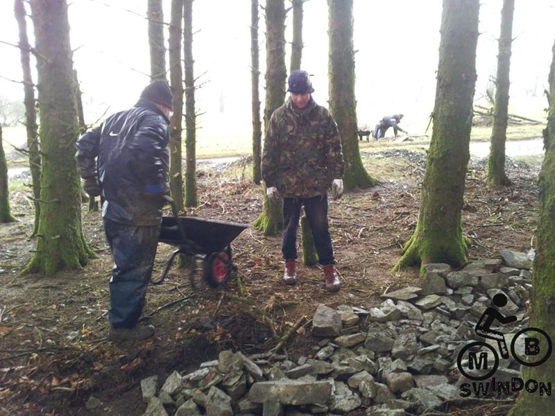 Sam Brown joined us early the next morning. Â An icy wind was blowing as we pushed the barrows of tools to the top of the trail. On the plus side the overnight rain had ceased. We immediately got to work dumping rocks into the trail base and hand shifting scalpings from piles that Jay had dumped ready for us. The dumper was used to shift more rocks from near the Mudtrek HQ and also to shift scalpings. Mud and rocks were used to build up berms on the tight corners.