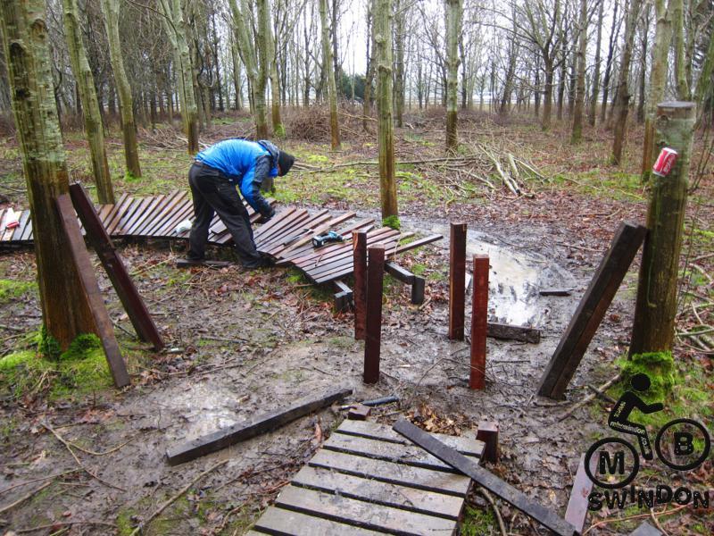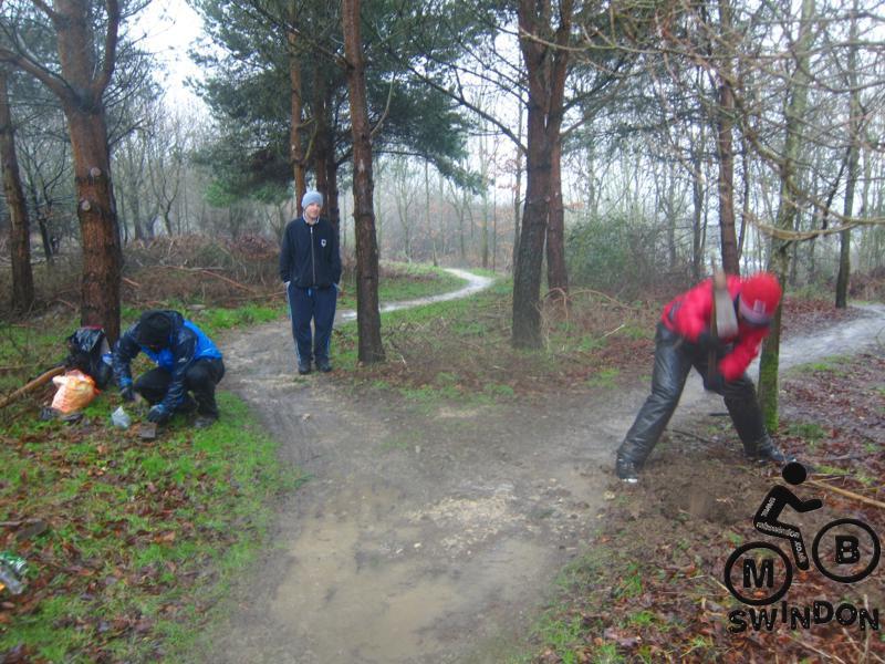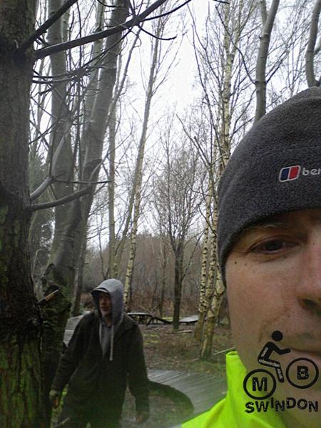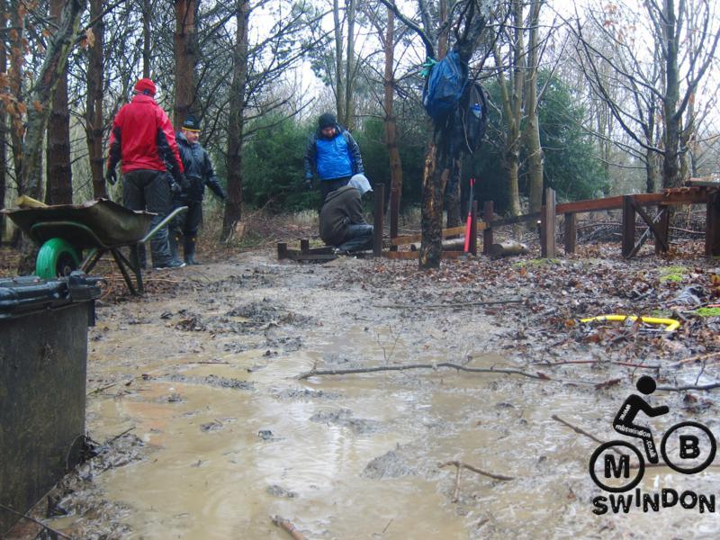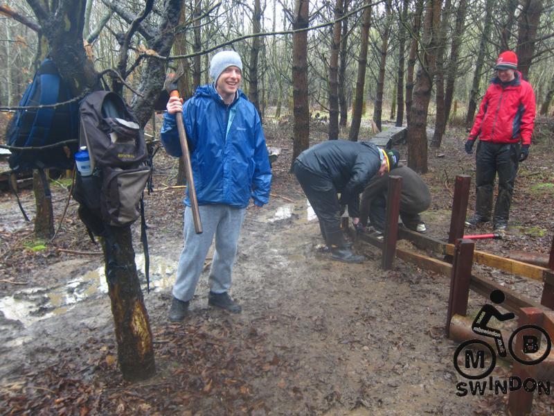 At our last big build day we’d lost one of our mattocks. After much searching we decided to record it as missing in action.  A few days before this build day a rider posted on our Facebook wall to say that they’d found a mattock. They moved it to a special secret location.  We sent Mike Jeffries off to collect it.  He was gone for a long time but eventually returned with the trophy. It took a bit longer than expected because he fell over in the mud.