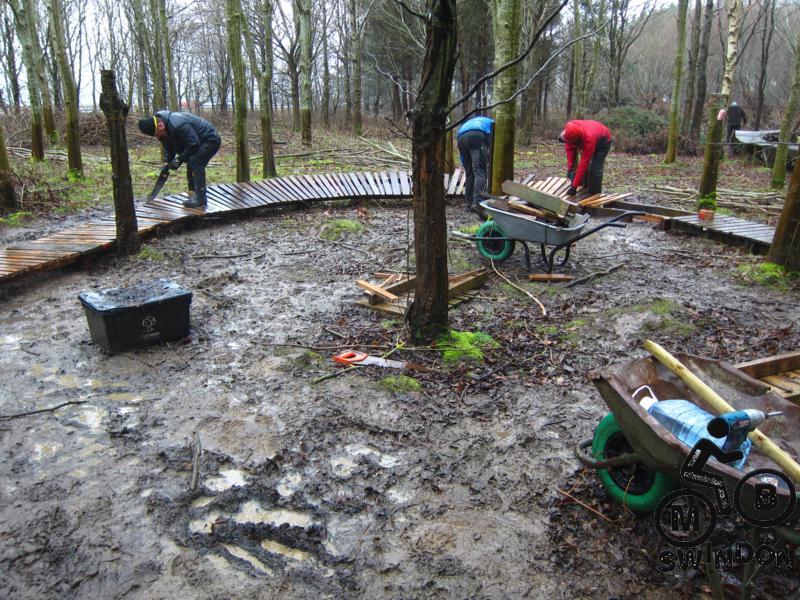 In the triangle  I found Jez, Phil, Kristian and Kirk hard at work finishing off sections of the raised woodwork. The weather gave the ideal ground conditions for banging the large stakes in. That’s about the only positive regarding the weather.