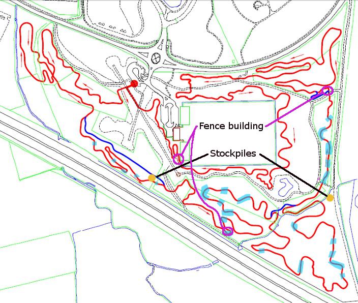 The last of the material was used to fill potholes in the triangle: a small hole after the rock feature, some bigger ones after that and the whole of the back straight. We were running very low on material by this stage and some areas only received puddle drainage. This area will be reinforced during 2013 once we’ve had some material delivered to the area.