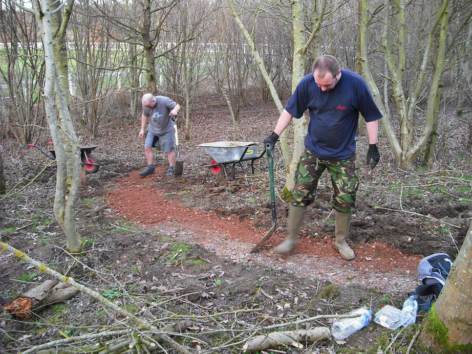 At that point a biker turned up and said he had an hour to do some trail building (sorry, didn’t catch name). So we shifted gravel from the car park to the northern edge of the pitch. Amazing progress was made, must have been about 24 barrow loads in just over an hour. We covered the whole of the loop there