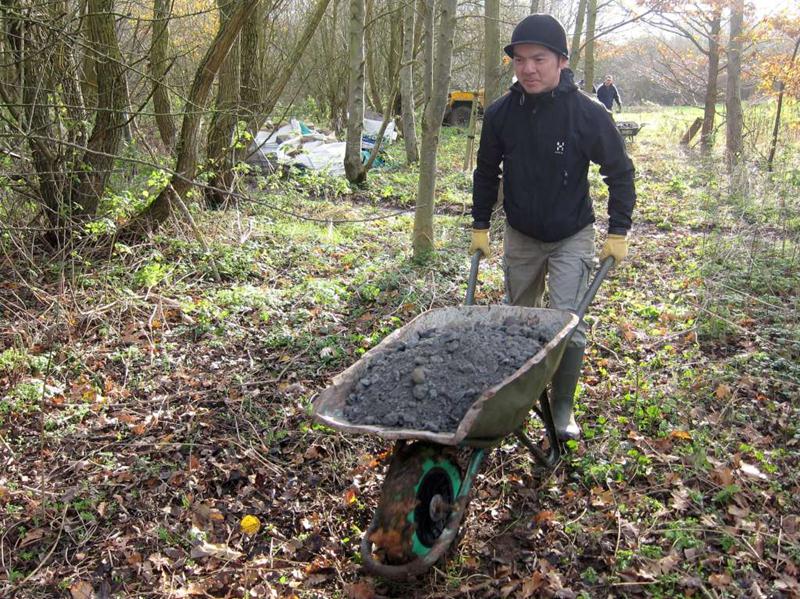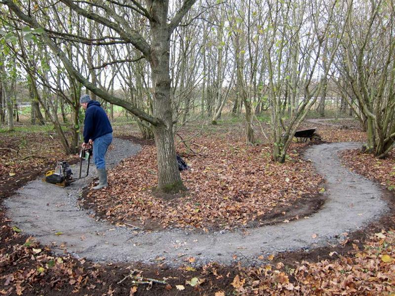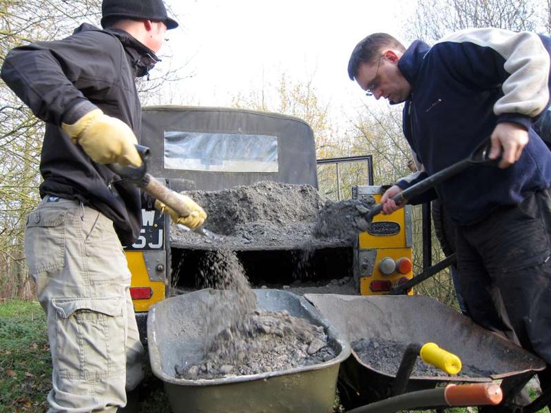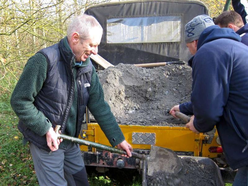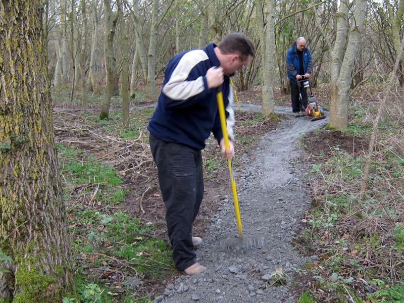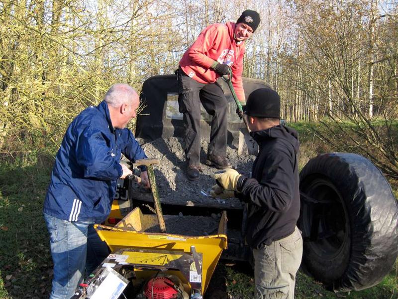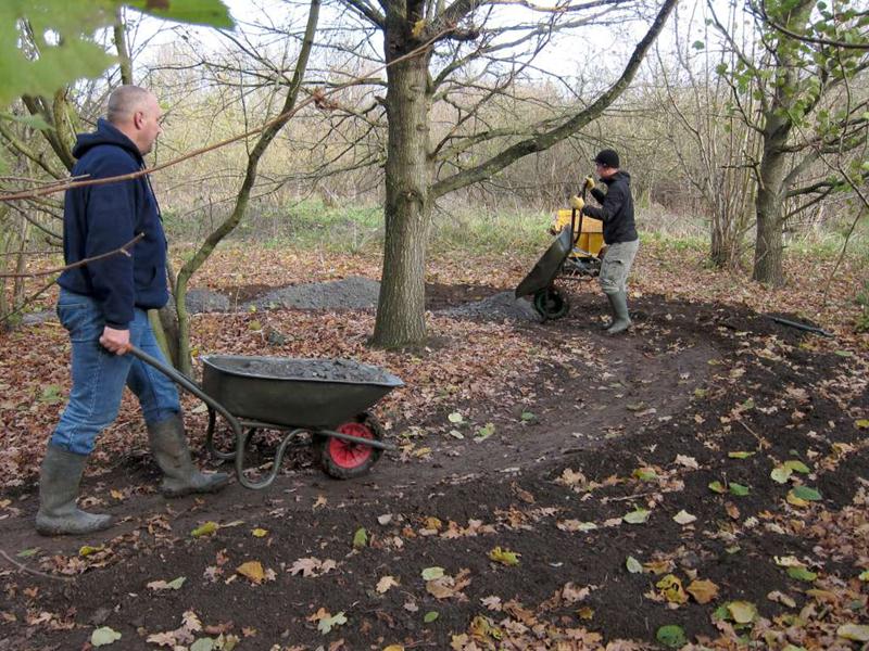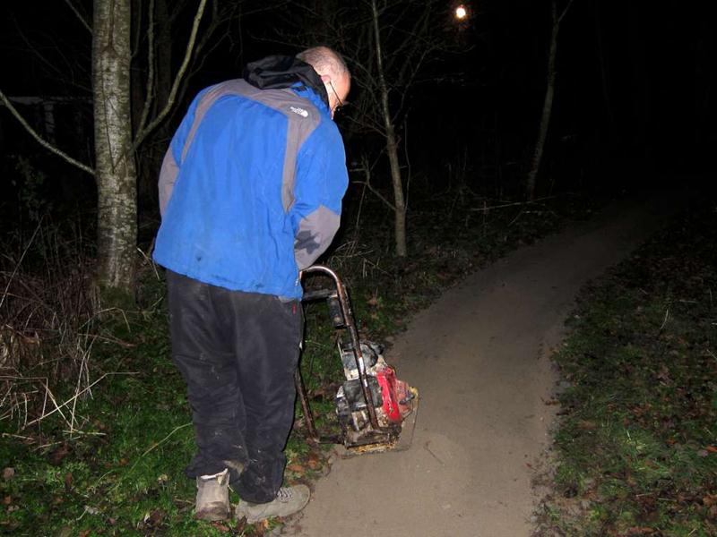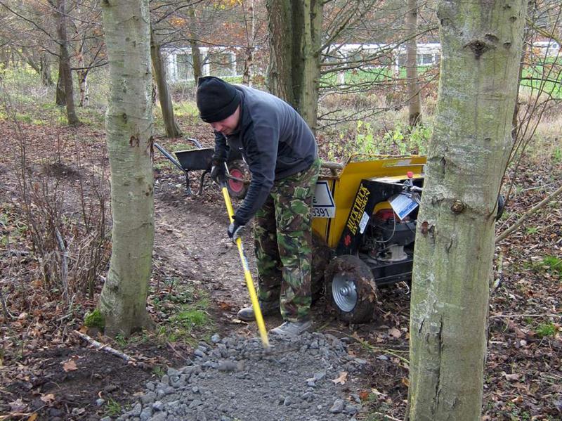 On the previous build day we’d surfaced about half of the trail section on the East side of the pitch (build report). Our plans for the day were to surface the remaining 120m. We’d had 20 tonnes of type 1 limestone chippings delivered on Friday morning. Things began at 9am when I arrived and Brandon hire delivered the Muck Truck and compacter. I was on my own for a short while so I carted two loads of chippings down to a boggy area near the end of the trail on the South West corner of the pitch. At 10am then Tony Holmes and his wife Margaret arrived, having travelled down from Worcester. A short while later Rafe arrived with his Land Rover and we made a start on moving material. A short while later and Chris arrived, followed shortly by Gary Lee, Tony La Porte, Robin and then Gary Yeates and Kristian. Phil turned up from work at 1pm and in a world first declared himself happy with the work that had been done so far. With a decent number of people like this then work progressed well and the whole section was surfaced and dusted before it turned dark. We can never stop until it is dark though, so we found a few bonus jobs to do. Jez had time to build up a berm in the following section with rubble, mud and then chippings. Finally, we filled in a very short section of mud in the alley way. This was the true channel tunnel moment in terms of surfacing the trail. Every part of the open trail had now received some sort of stone based surfacing product. A great day’s work and a significant moment for the club and trail. Thanks to everyone who again worked so hard for the project. The east side was first cut out in October 2008. Some minor surfacing was done in February 2009 plus some reshaping in April 2009 (no photos yet). |