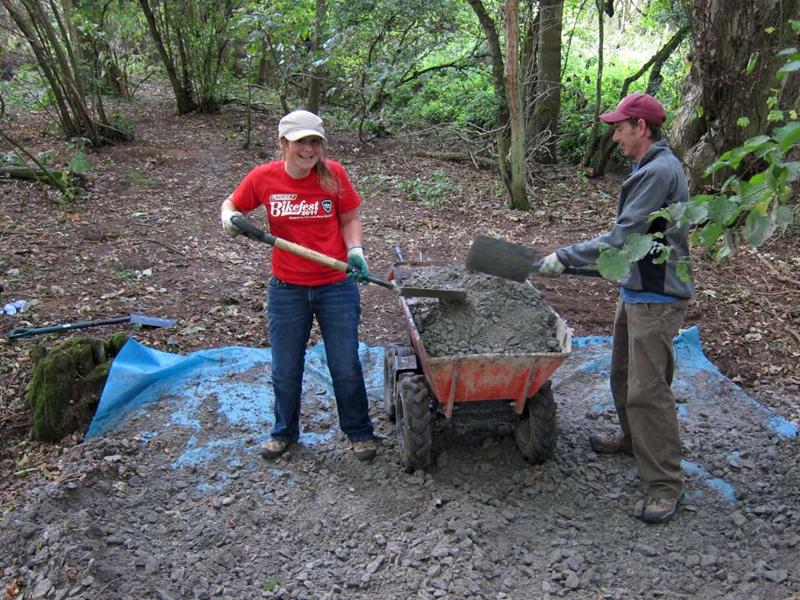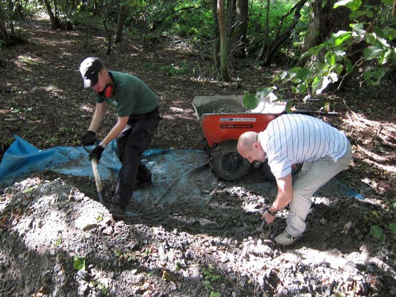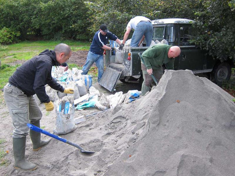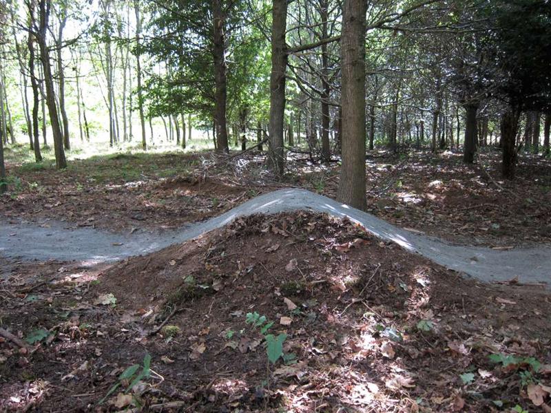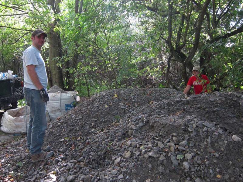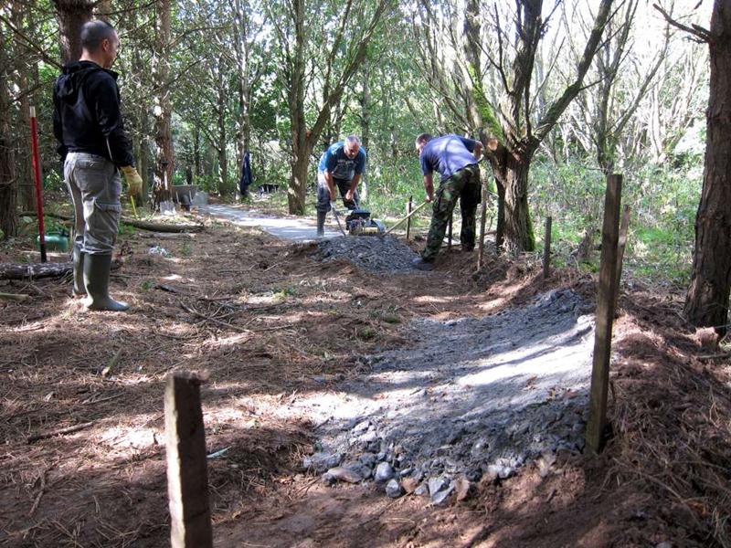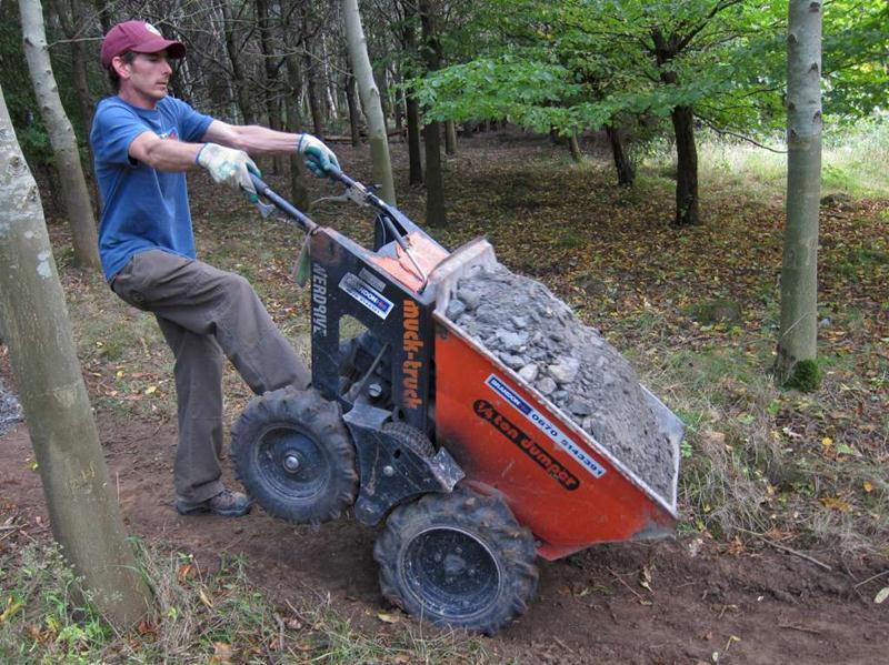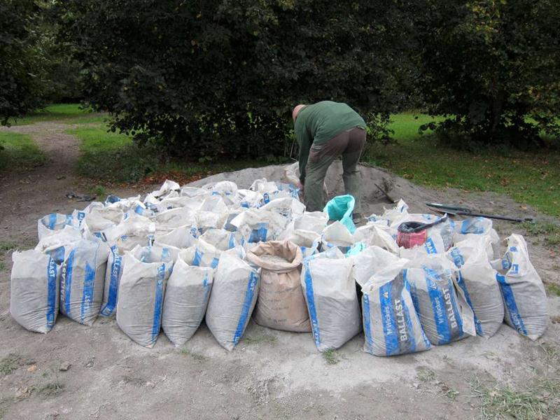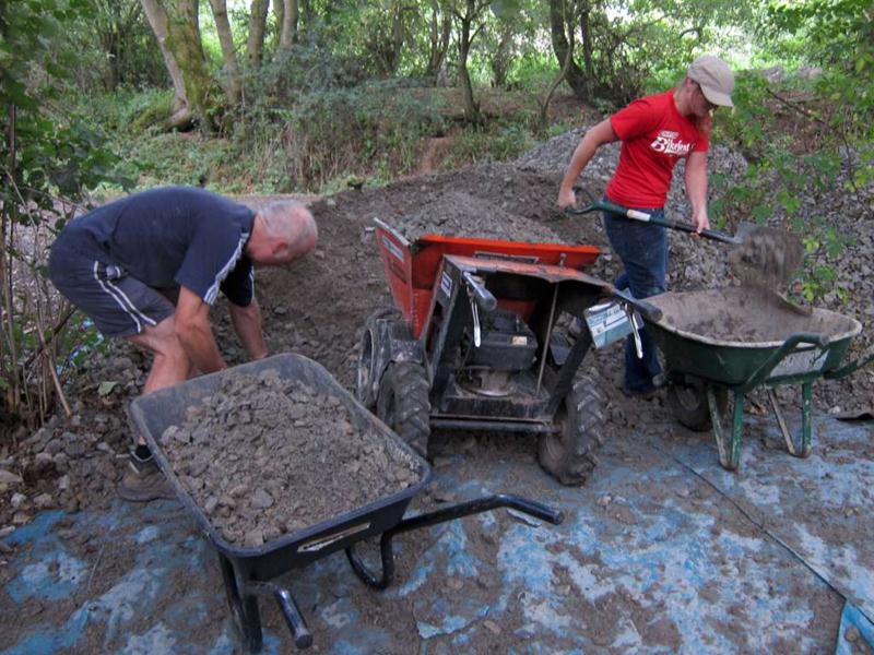 We’d spent the last few months digging out the new triangle section (see the build reports: June – Aug, 3rd Sept, 8th Sept, 10th Sept). Our aim for this weekend was to shift as much gravel as possible. We’d had another 30 tonnes tipped next to the triangle on top of the 20 tonnes that were already there. We also had 10 tonnes of limestone dust tipped in the car park. Phil turned up early to start work on the first berms and rollers. I arrived in time to meet Brandon Hire and found Kristian and Tony there ready to go. Nick joined us, so we had four people in the triangle. Meanwhile a second work party of myself, Nigel Gregson, Pete Ratcliffe and Jason started filling sacks with dust. Gary Lee Chris Hopkinson and Jon Speed arrived a bit later. It took us most of the day to shift all of the dust. We used about half of it via several loads onto Piper’s hill and down by the pond. The remainder was shifted to the triangle, with half of it next to our gravel pile and the remainder in the bottom corner. Ben, Kate and Gary Yeates joined us in the afternoon. By mid afternoon then the trail building group had filled in from the entrance bridge, built several rollers and a few berms. The limestone dust received universal approval. The idea is that it will bind the material together. The limestone chippings that we use for the surfacing can beome loose without this extra dust in it. We had an on-site BBQ in the evening and then went home as darkness fell. Thanks to everyone who came along and helped make it happen. On to the Sunday build report. |