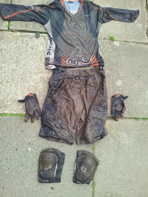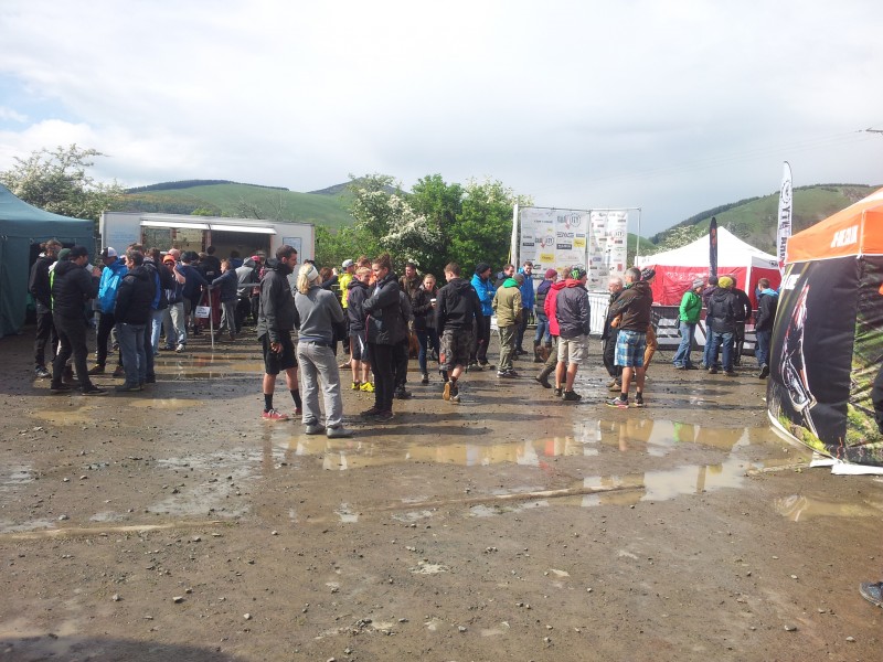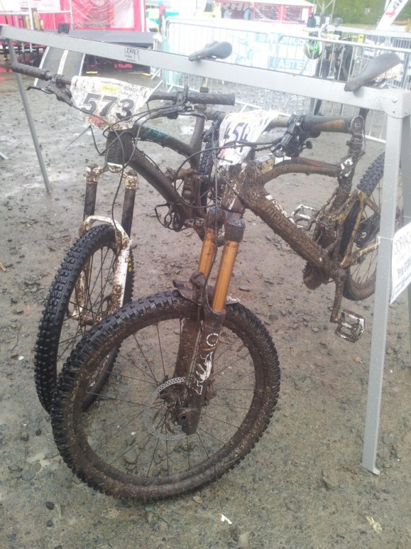 I was out from the arena by 10am but after the first 5 minutes of the climb the rain descended… First stage and there was mud and spray everywhere, usually I’d be very cautious with the spds but for once I had no concerns and could dab a foot whenever I needed – very glad I made that choice. Goggles on the other hand were almost useless, they did stop mud getting in the eyes but I was almost blind by the stage end! Also at this point I must apologise to the sponsors that were once visible on the shirt, one stage done and I was covered head to toe in mud! Stage 2 had a quick dismount after a root moved my front wheel a metre to the left, I also took this chance to take off the goggles which were only hampering my vision. Stage 3 and for the first time ever I cleared the rock section without issue! Stage 4 was great fun and there was a lot of grip available on the wet dirt. Stage 5 again and a clean run this time gave a 4:44 despite the mud and obscured goggles.