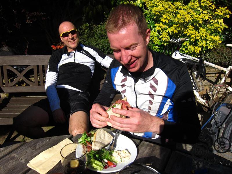 This was followed by a rollercoaster section out on to a bridleway and a rocky descent to the road. It was slightly uphill to Stinchcombe and slightly downhill to Dursley and the Old Spot pub where we filled the garden with bikes. There were some tired looking faces here I must admit but a drink and a sandwich would soon sort that out. The group of riders that we had met up by the golf club came into the pub saying they had lost one of their group. Apparently he had asked some other riders which way to go and they sent him the wrong way. I’ve no idea who that could have been (Jez?). Oops.